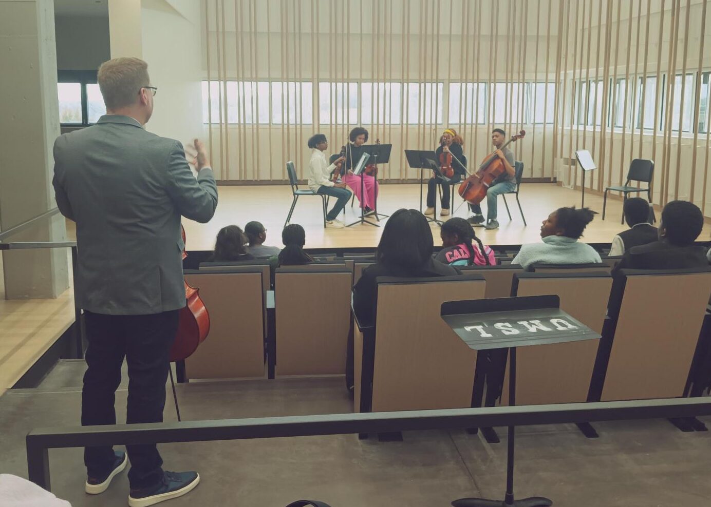 February 21 – SLSO cellist Bjorn Ranheim led a master class for students in the institution’s Peer to Peer program, a mentorship initiative to steward the talents of aspiring Black and Latiné musicians. (Photo by Joseph Hendricks)